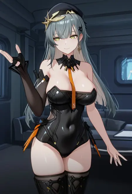 Thoth AG,灰鹭绽放,绿眼睛,灰发,长发,发夹,单耳环,帽子,贝雷帽,大胸,裸肩,脱落的领子,黑色紧身衣,遮住肚脐,单袖,单只手套,灰指甲,黑色过膝袜,大腿靴