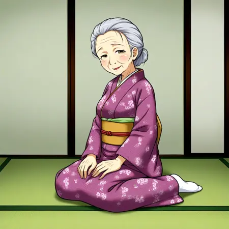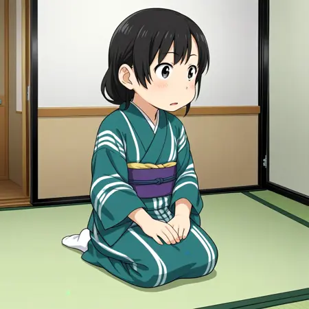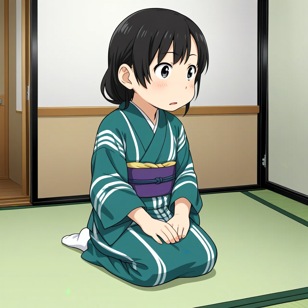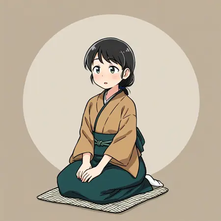 正座 – 膝をそろえてふくらはぎの上に座り、背中を伸ばし、足の指を下に折り曲げる格式高い姿勢です。このLoRAは、座布団(日本の床用クッション)と組み合わせると、茶道、正式な会話、神社参拝などのシーンで優雅で現実的な雰囲気を演出します。