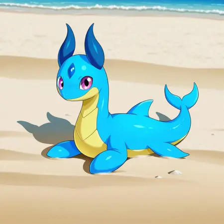 aquatic, water dragon, blue and yellow scales, purple eyes, blue forehead jewel, horns, flippers, tail, dorsal fin,