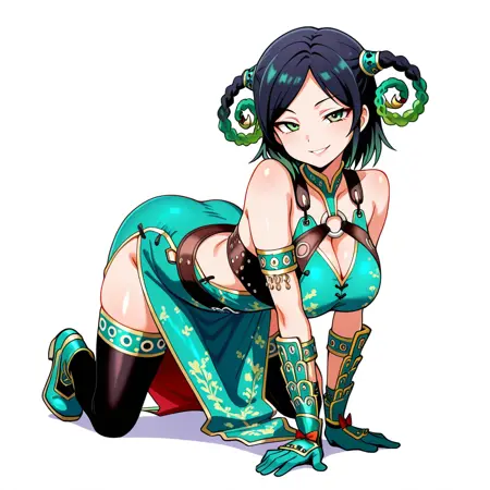 jsgmele, 1girl, solo, green eyes, large breasts, black hair, braided hair rings, gloves, thighhighs, bare shoulders, dress