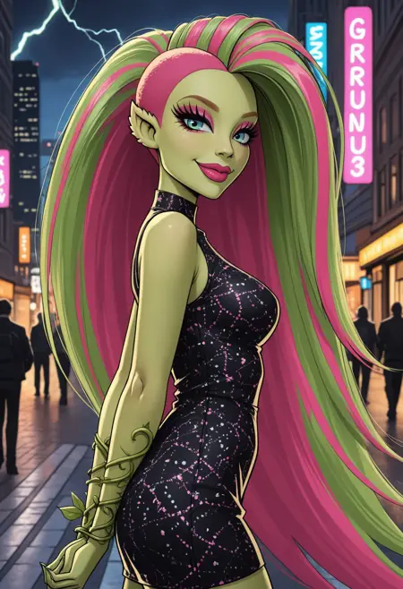 MHV3nus, 1girl, makeup, multicolored hair, pink eyeshadow, pink hair, blue eyes, streaked hair, green hair, green skin, plant girl, pointy ears, sidecut