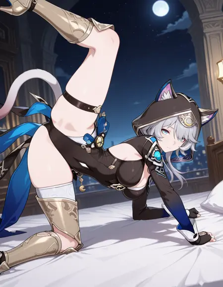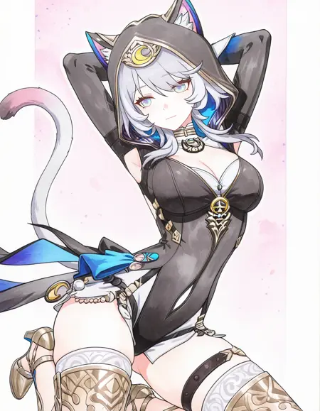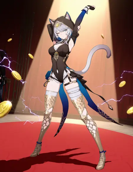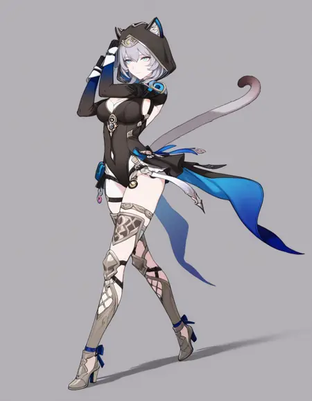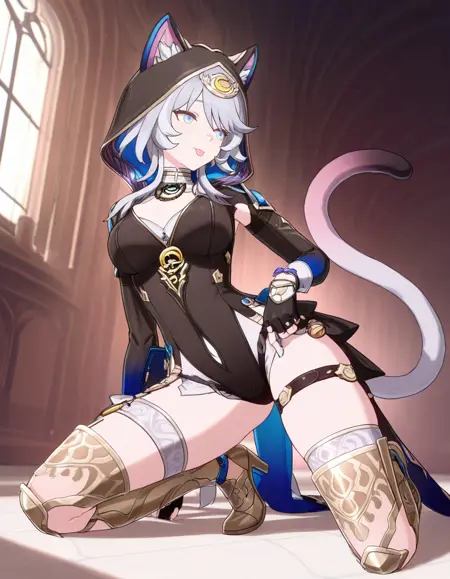 mai_cipher_(honkai_star_rail),animal_ears,grey_hair,blue_eyes,hood,black_leotard,armored_boots,cat_girl,high_heels