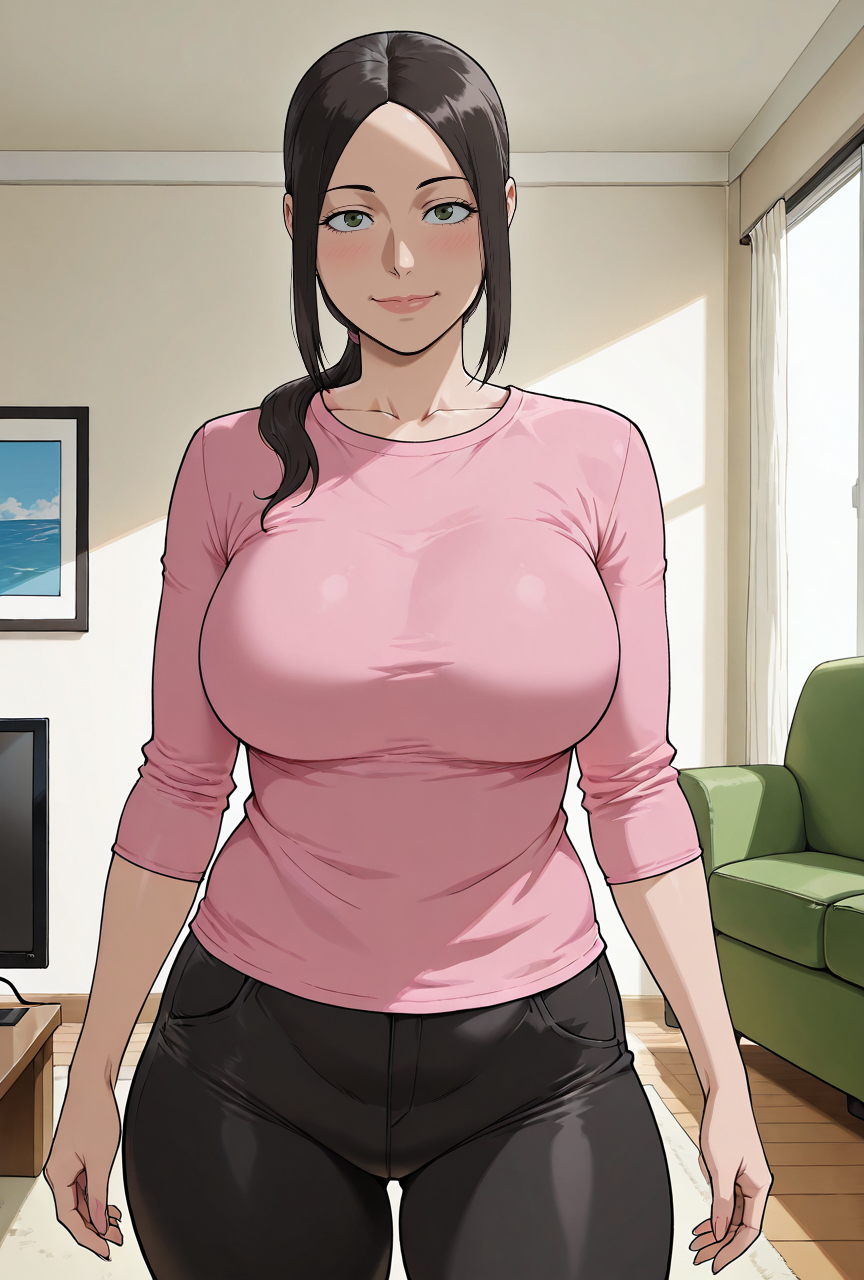 mom, mature female, green eyes, black hair, parted bangs, low ponytail, long hair,