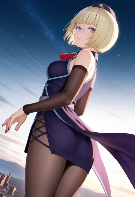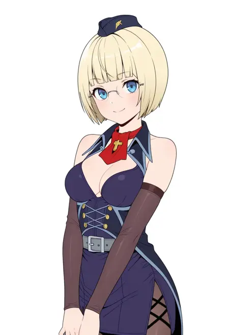 garrison cap,red ascot,detached sleeves,collar,purple tailcoat,purple short dress,sleeveless dress,breast cutout,bare shoulders,corset,gray belt,side slit,cross-laced slit,pantyhose,ankle boots,gray boots,(ankle lace-up),