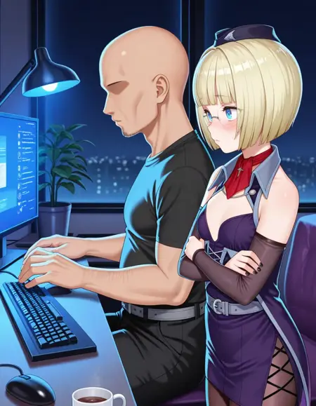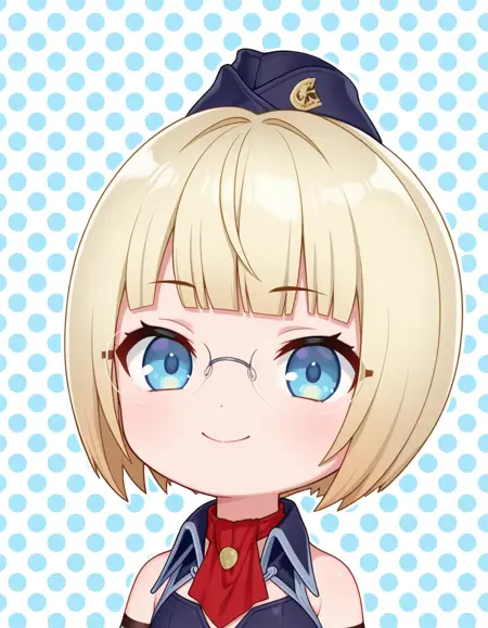 sitri (emotion creators),blonde hair,short hair,blunt bangs,blunt ends,blue eyes,black nail polish,rimless eyewear,