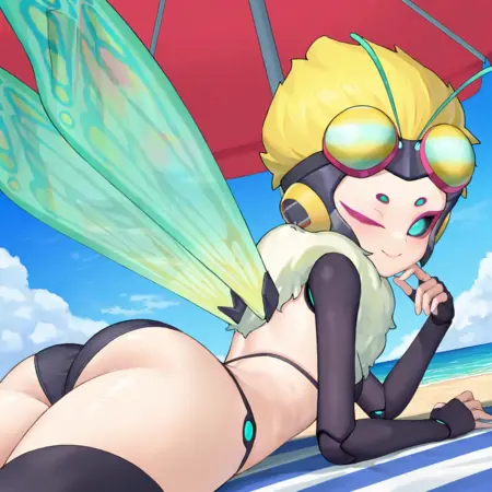 인간형, 여자, 관절, 단발, 금발, 밝은 피부, 검은 공막, 티얼 눈, 보라색 아이라이너, 짧은 눈썹, 목 털, 이마 보호대, 팔찌, 다리 감싸개, 곤충 날개, 손가락 없는 장갑, 바디슈트, 절지동물 복부,