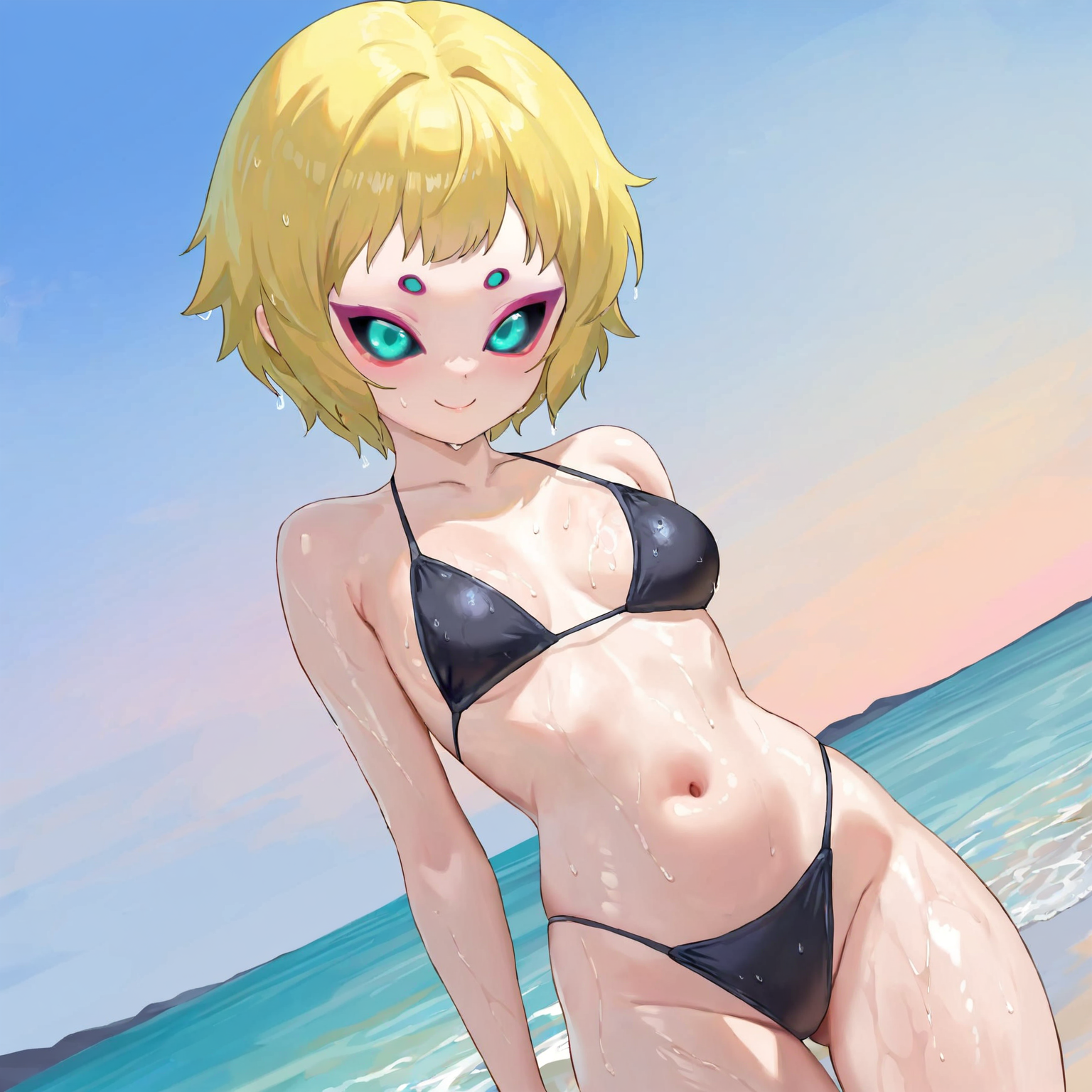 人型、女性、関節、ショートヘア、金髪、薄い肌、黒い白目、ターコイズ色の目、紫のアイライナー、短い眉、首の毛、額のプロテクター、ブレスレット、足巻き、昆虫の翼、指なしグローブ、ボディスーツ、節足動物の腹部、