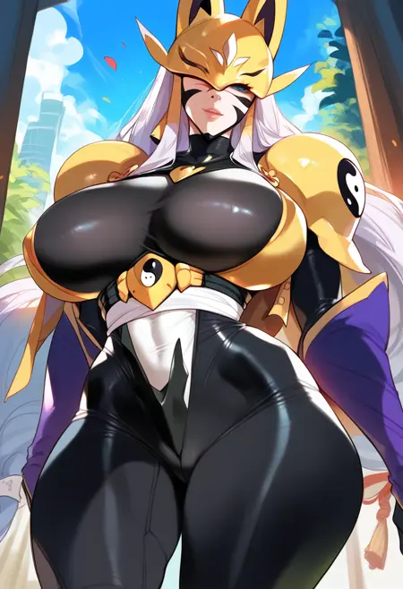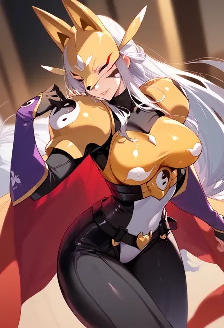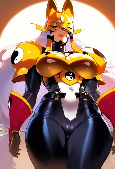 トリガー:ponysakuya、長い髪、狐のマスク、大きな胸、化粧、肩のアーマー、ボディスーツ、陰陽、アーマー