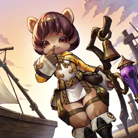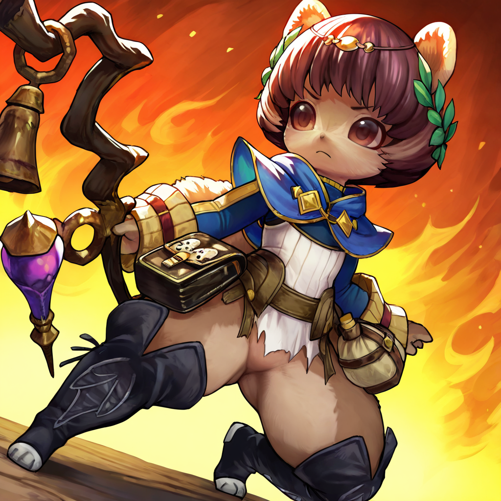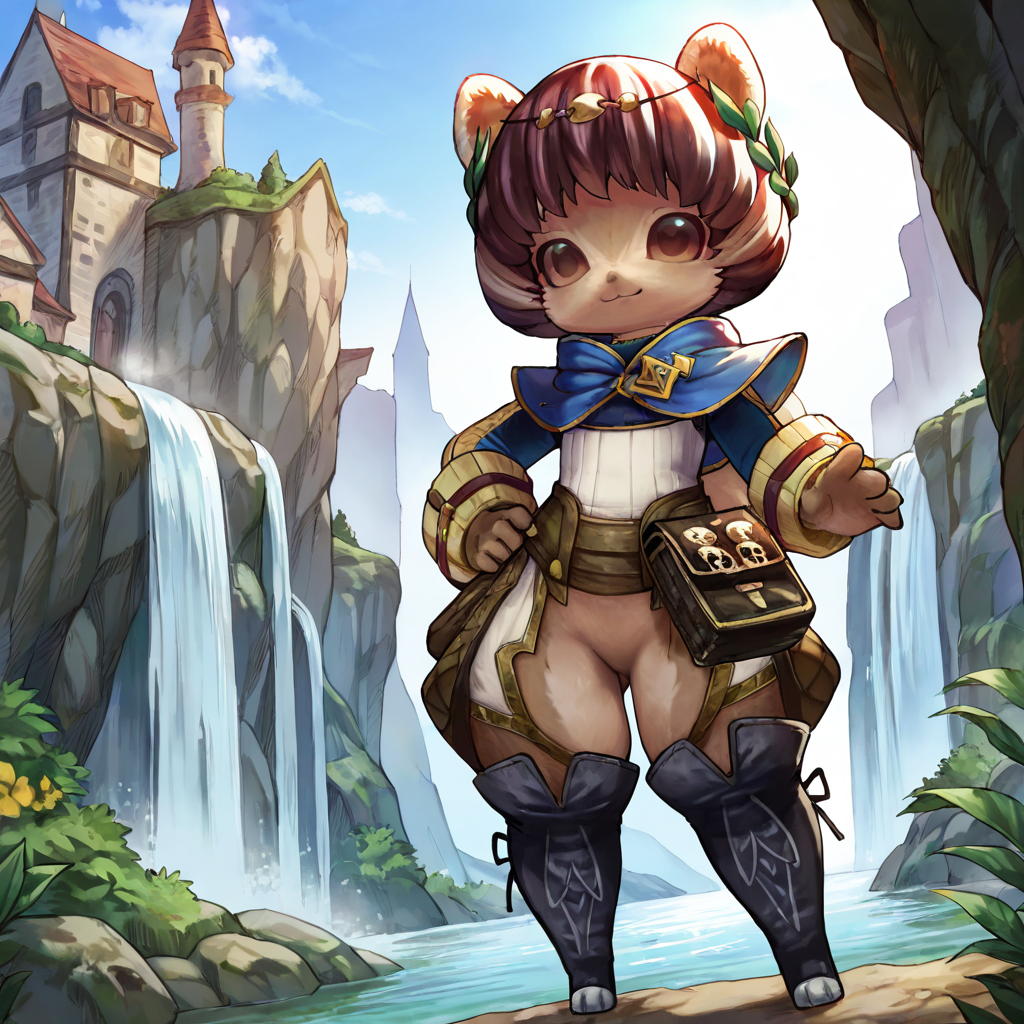 RorotataCS, 앤트로, 여성, 체르키, 키작음, 갈색 털, 5성 옷, 단발, 갈색 머리, 갈색 눈, 머리 장신구, 노란 코트, 힙 방어구, 가죽 부츠, 하의 없음,