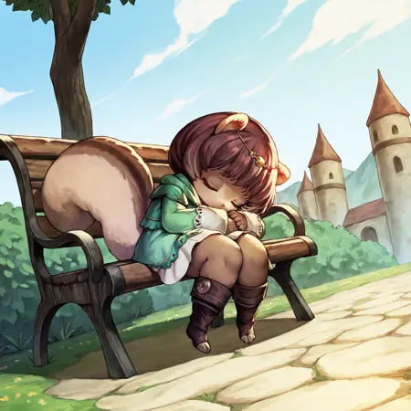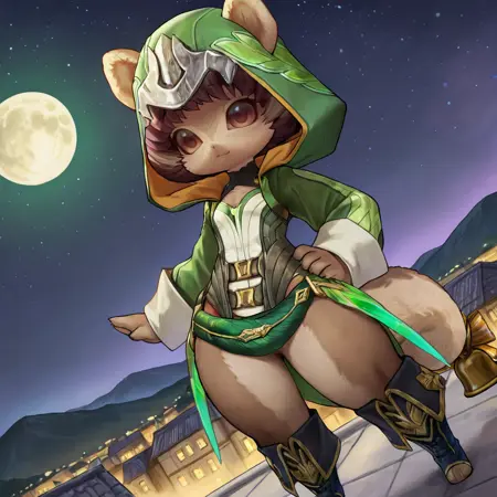 RorotataCS, 앤트로, 여성, 체르키, 키작음, 갈색 털, 3성 옷, 단발, 갈색 머리, 갈색 눈, 녹색 테일코트, 허리 가방, 전투 부츠, 후드 올림, 꼬리에 종, 하의 없음,