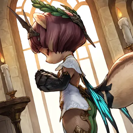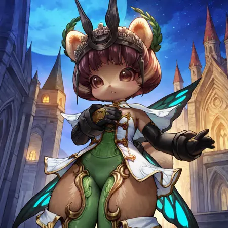 RorotataCS, 앤트로, 여성, 체르키, 키작음, 갈색 털, 6성 옷, 단발, 갈색 머리, 갈색 눈, 헤드기어, 잎 모양 머리 장신구, 캐플릿, 바디수트, 분리형 소매, 힙 벤트, 나비 날개,
