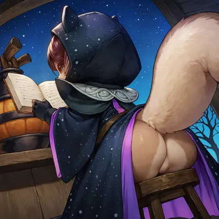 RorotataCS, 앤트로, 여성, 체르키, 키작음, 갈색 털, 2성 옷, 단발, 갈색 머리, 갈색 눈, 머리 장신구, 보라색 후디, 검은 부츠, 꼬리에 종, 하의 없음,