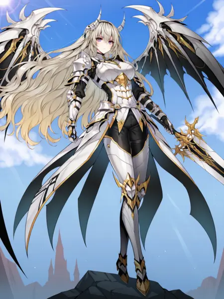 | 학습된 단어 | Closers_Draconian, black thighhighs, white armor, detached collar, white thigh boots, white headgear, white demon horns, white shoulder armor, white gauntlets, white high heel boots, white pauldrons, center opening, white armored boots, white greaves, white bikini armor, mechanical wings, white theme, gold trim,복사됨! |