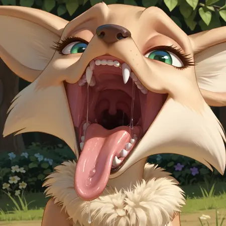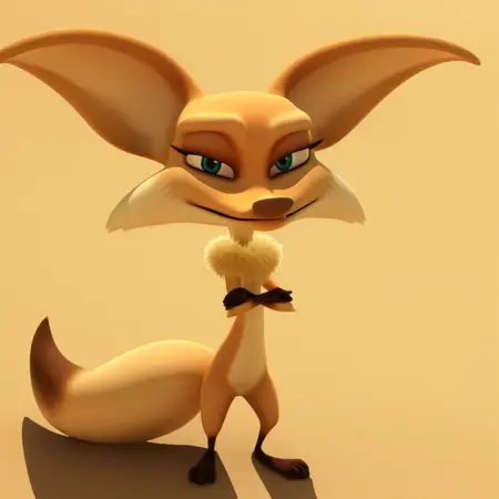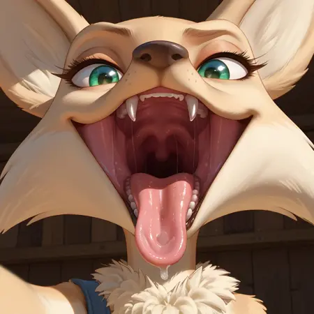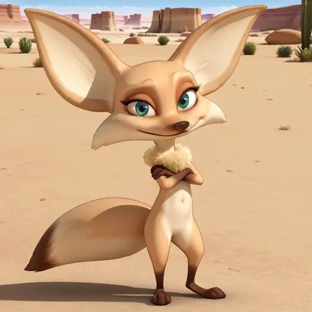 fox, fox girl, fennec fox, tan fur, two-toned fur, green eyes, large ears, black nose, fluffy neck fur, dark arms, dark legs, fox tail,