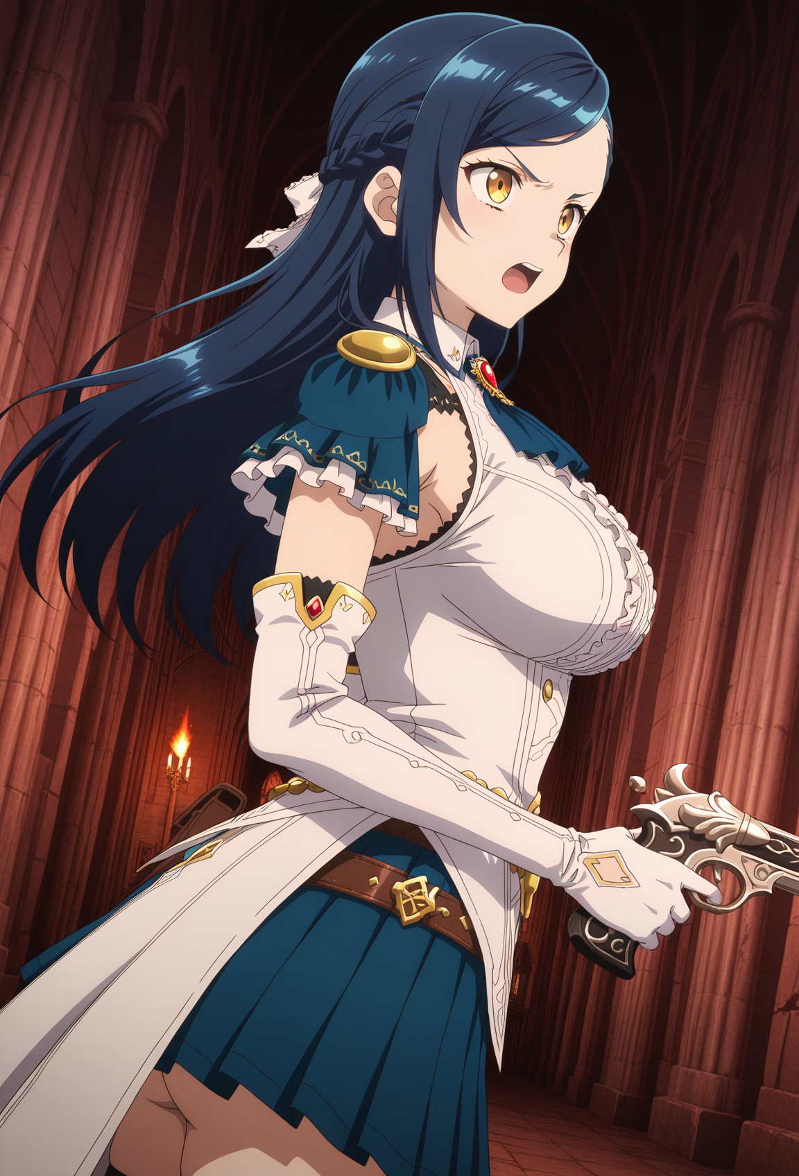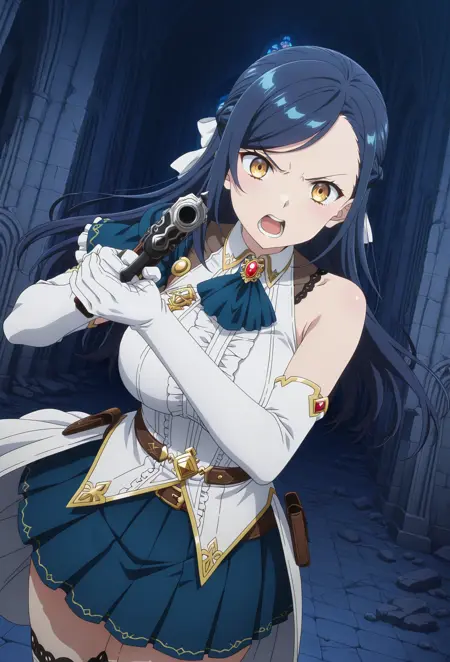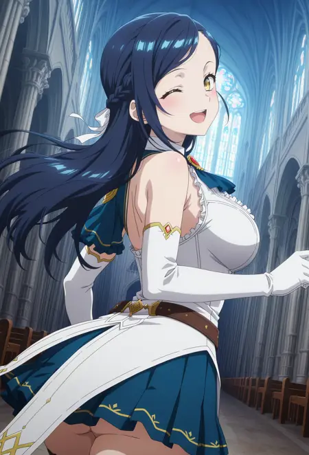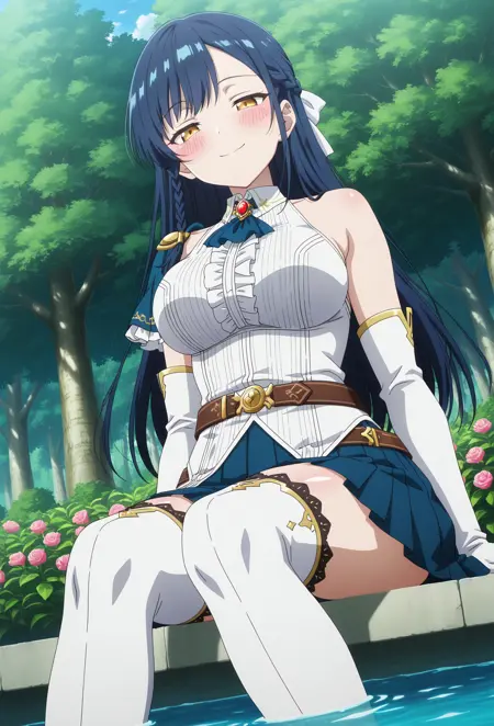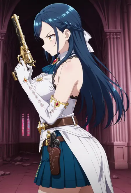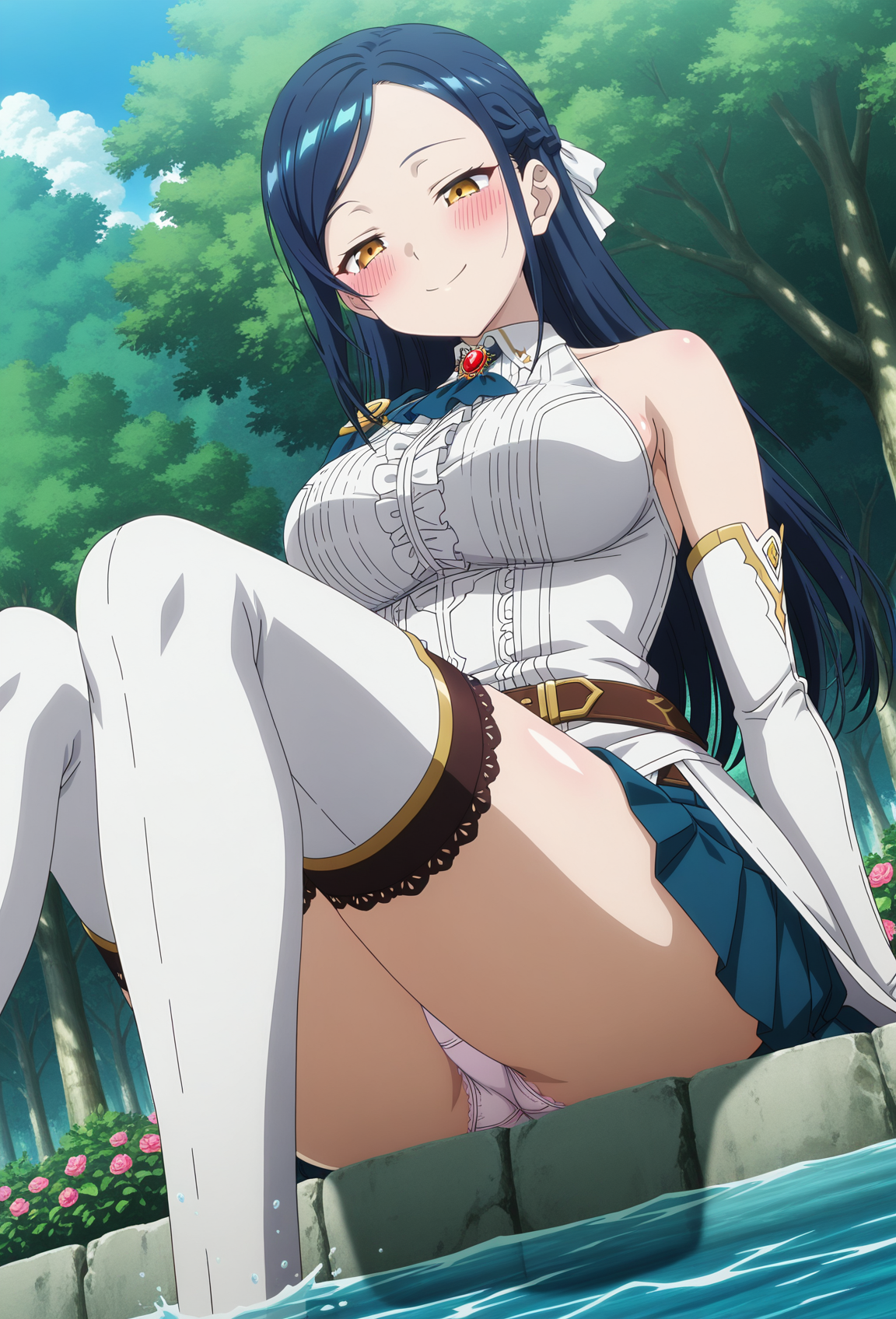 Jul_ge, 1girl, solo, 大きな胸, 大きな臀部, 黒髪, 青髪, 長髪, 編み込み, サイドバンプ, 額, 髪リボン, 黄色い目, アスコット, 青いアスコット, ブローチ, 白いドレス, 袖なし, 片方の肩露出, グローブ, 肘までグローブ, 白いグローブ, フリル, スカート, プリーツスカート, 青いスカート, ベルト, ファスナー太もも長ズボン, 太ももブーツ, 白い脚部装着, 白いパンツ, レース縁取りパンツ,