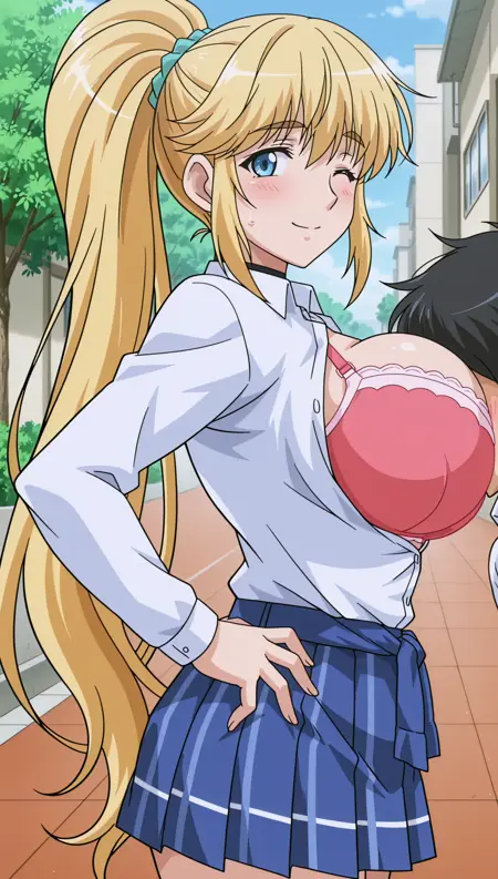 선택적 트리거 단어: 긴 소매, 스쿨 유니폼, 재킷, 흰 셔츠, 주름 치마, 프릴, 초커, 미니 치마, 칼라 셔츠, 빨간 치마, 분홍 브라, 셔츠를 넣음, 허리에 스웨터