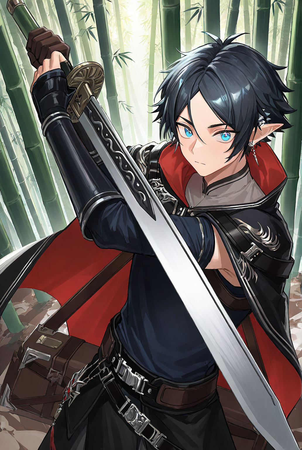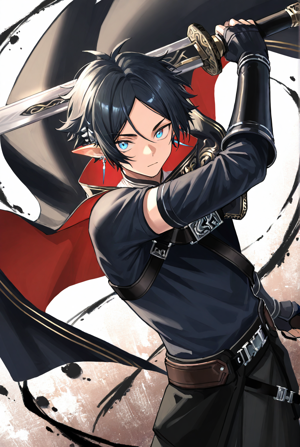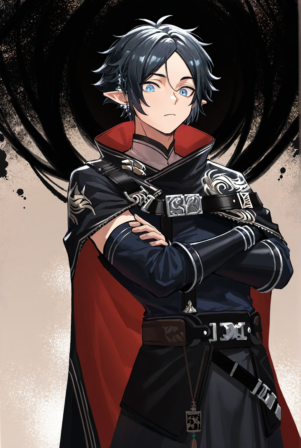 zu0 le, pointy ears, short hair, black hair, cape, black cape, belt, blue eyes, earrings, jewelry, gloves, shirt, black footwear