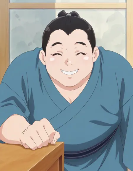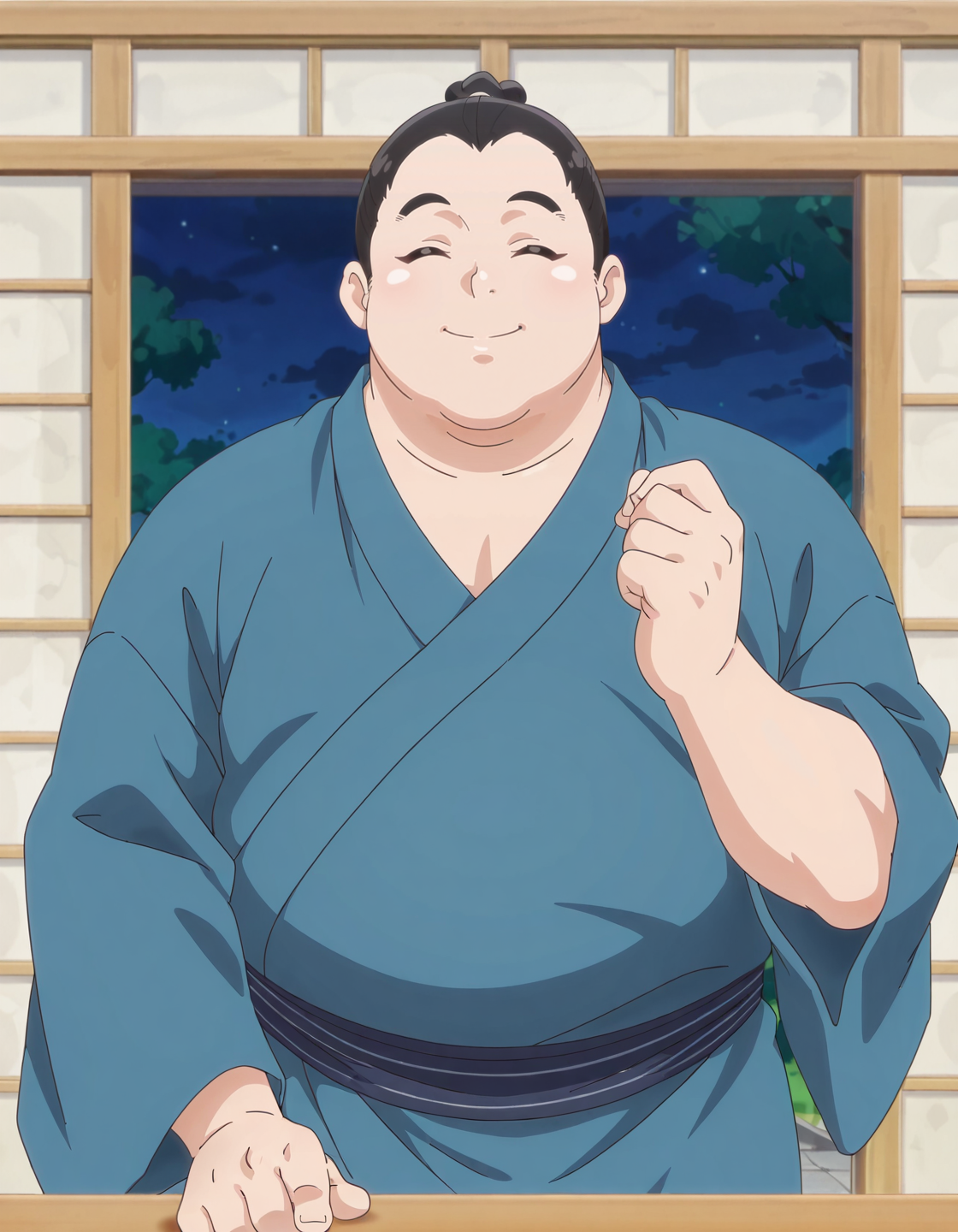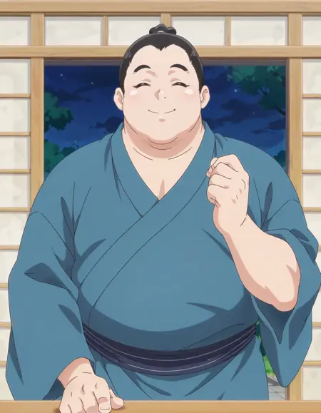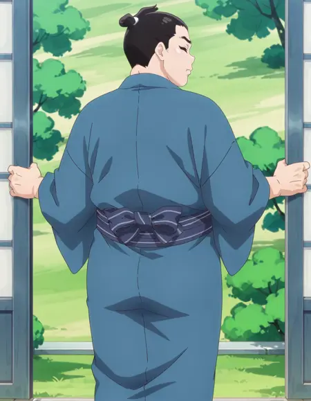 anime screencap,1boy, solo,kurikyuta,japanese clothes,closed eyes, blue kimono, lora:kurikyuta_IL:0.8high definition,amazing quality,best quality,very aesthetic,masterpiece,absurdres,