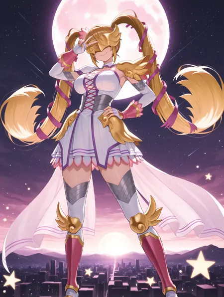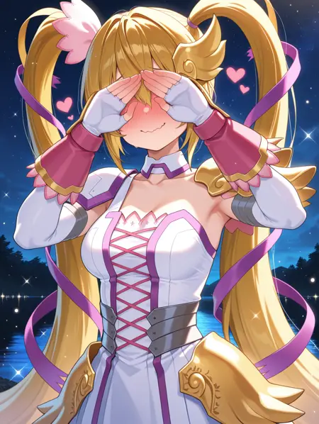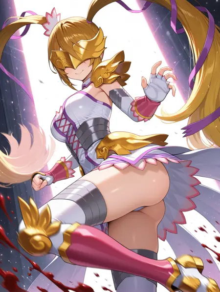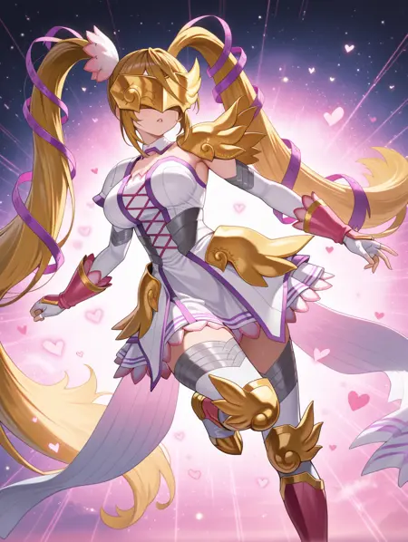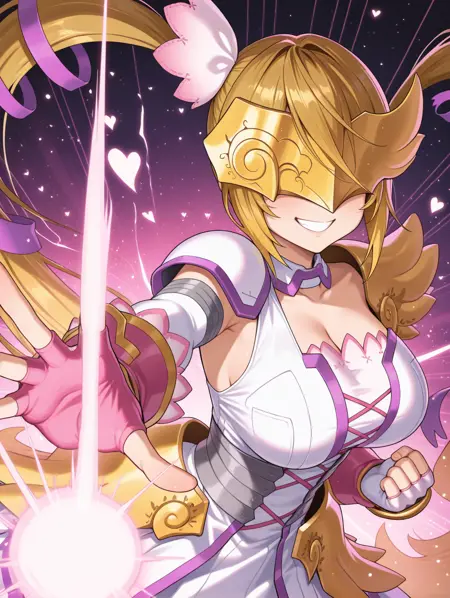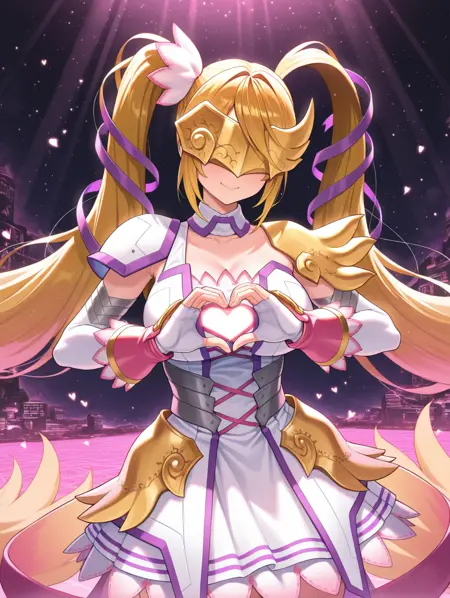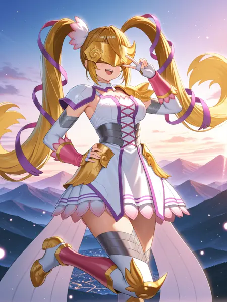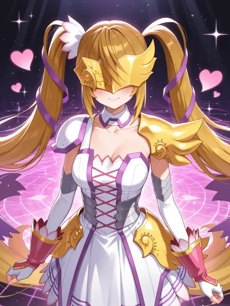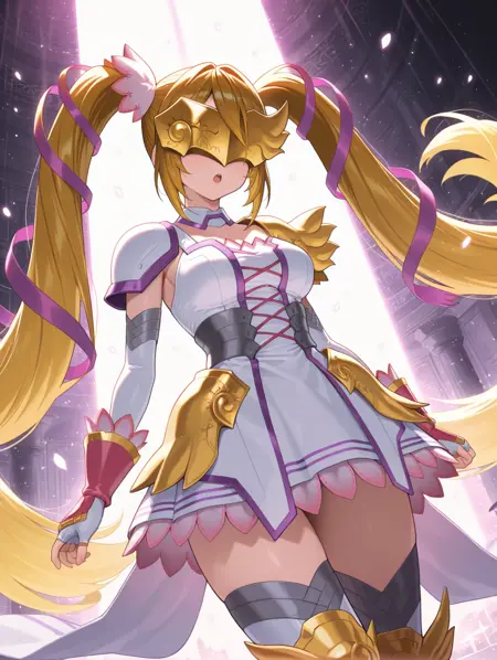 タグ(衣装):髪飾り、髪リボン、ゴールドマスク、非対称な肩アーマー、取り外し可能なカラー、白いノースリーブドレス、アーマードコルセット、フィンガーレスアーマードグローブ、アーマードブーツ