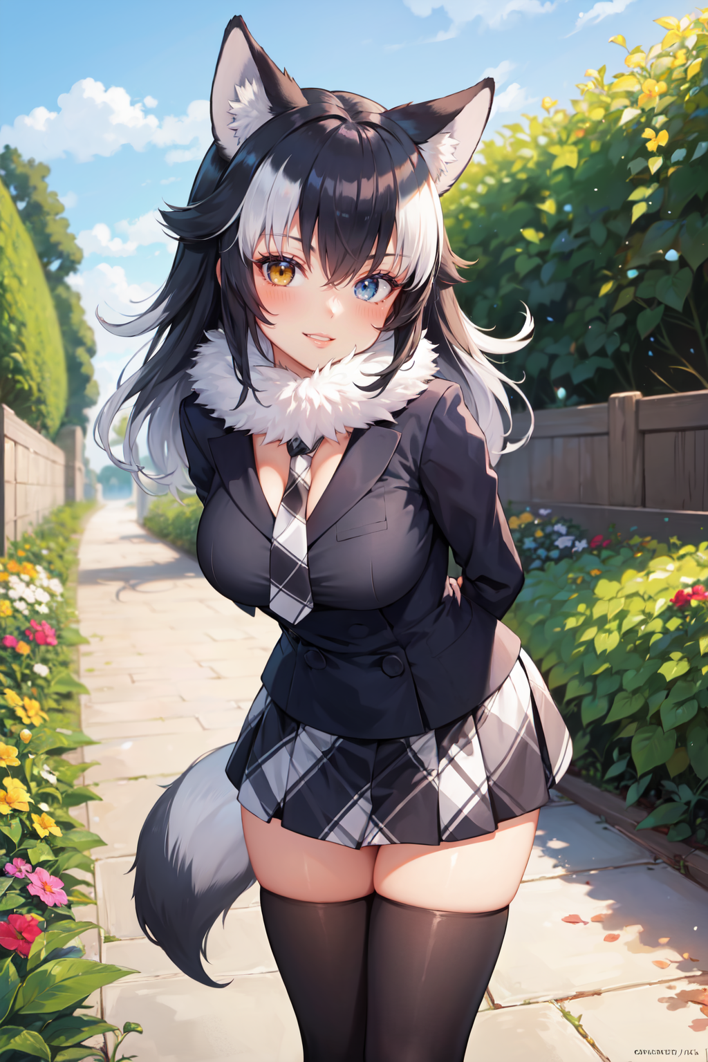 grey_wolf, animal ears, wolf ears, long hair, heterochromia, white hair, wolf girl, wolf tail, tail, fur collar, long sleeves, necktie, gloves, large breasts, white gloves, skirt, thighhighs