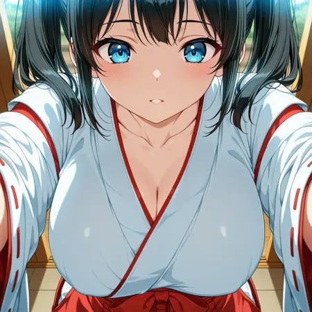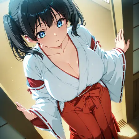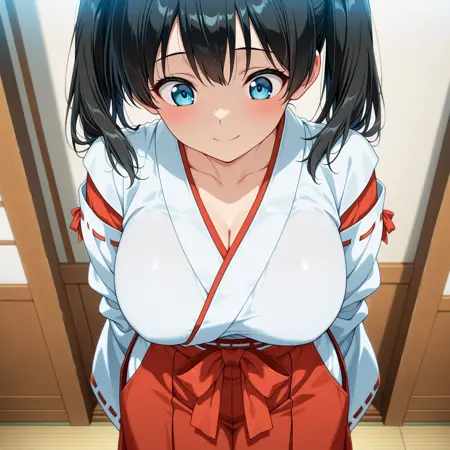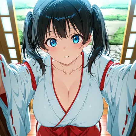 Civitai スピンオフキャラクター ツインテール黒髪巨乳巫女 / Spin-off character: twintail black hair, large breast miko.