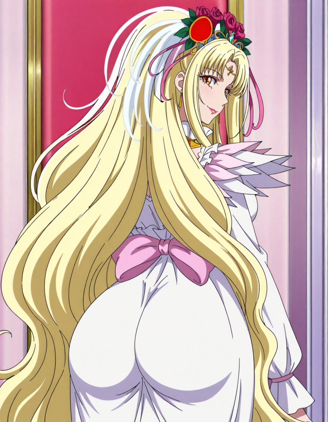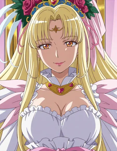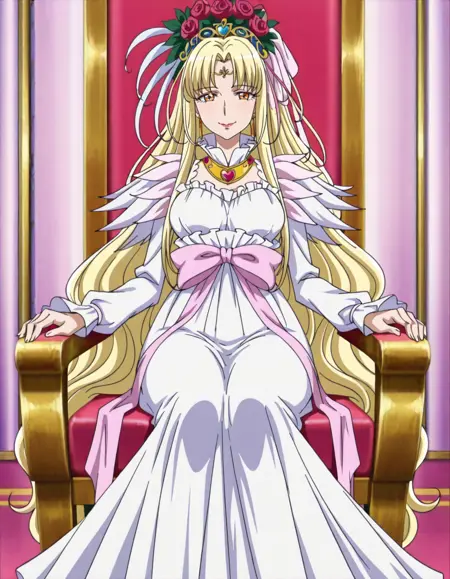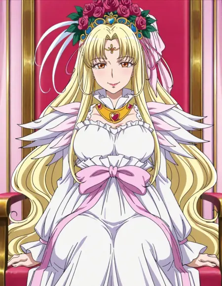 动漫截图,单人,1女孩,aphroditesp,白色连衣裙,发饰,头饰,面纱,珠宝,玫瑰,粉色蝴蝶结,长袖,lora:aphrodite_IL:0.8 高清晰度,绝佳画质,最佳画质,极具美感,杰作,absurdres,