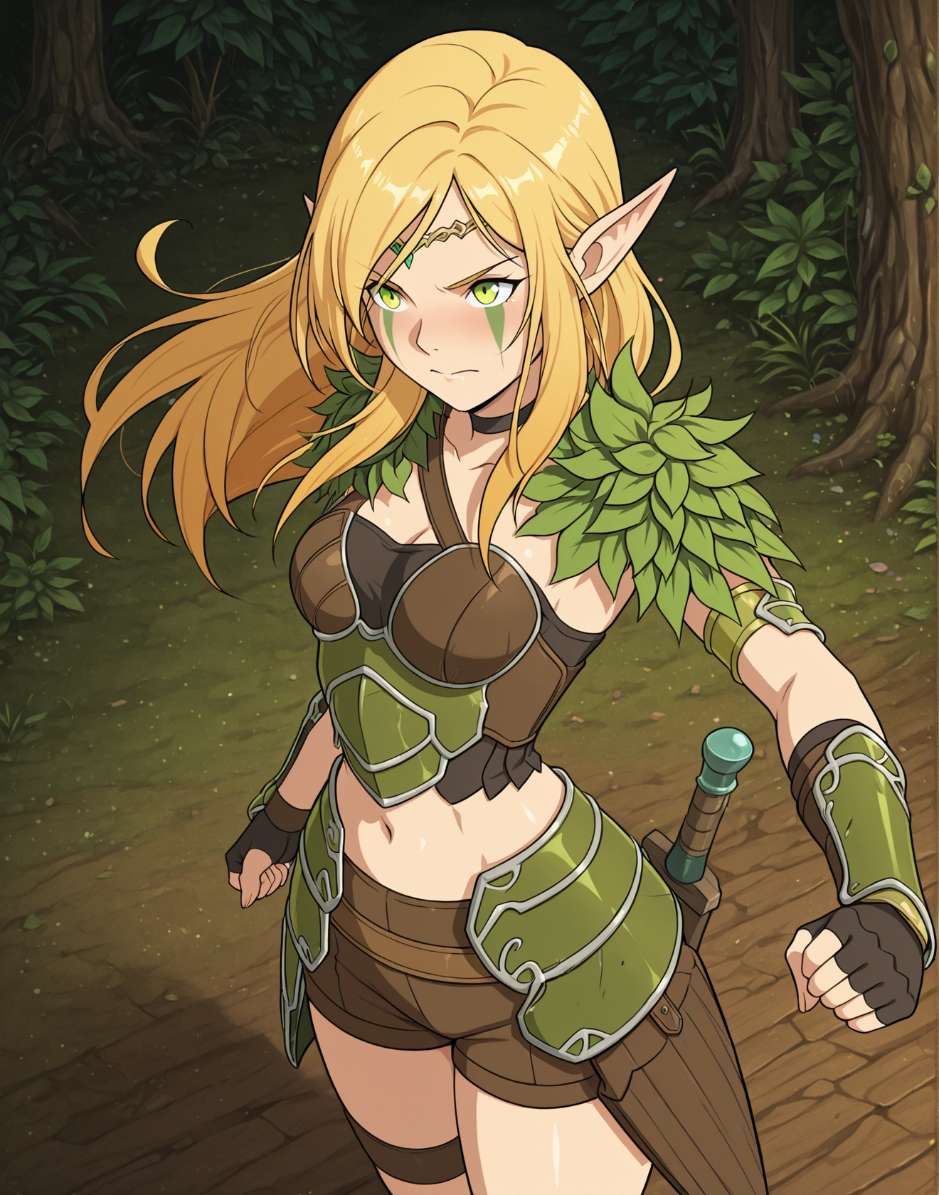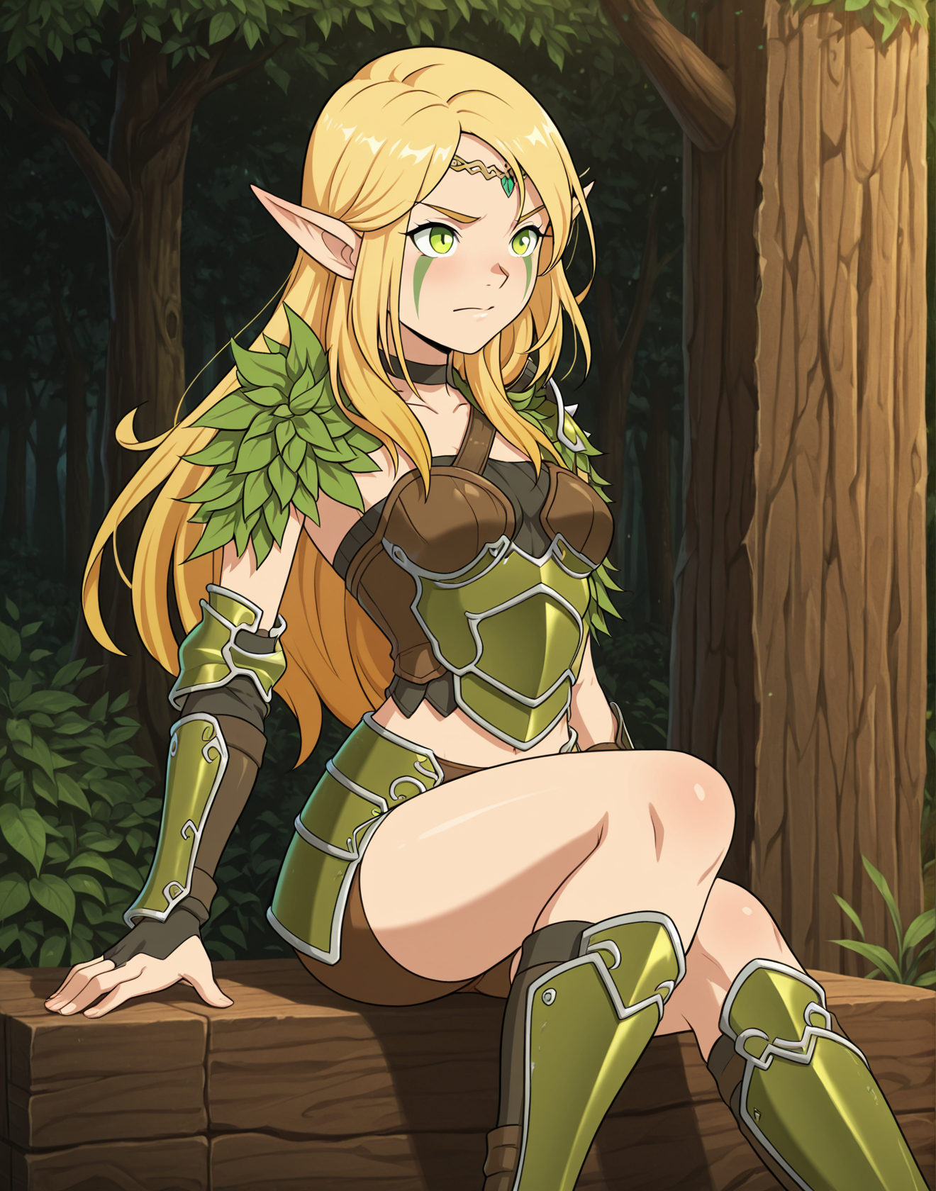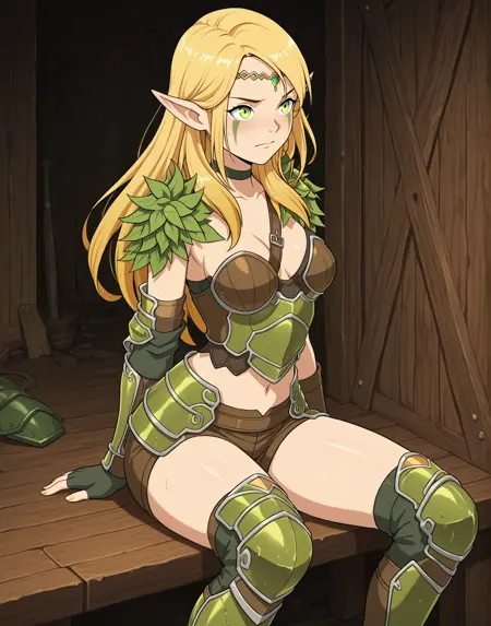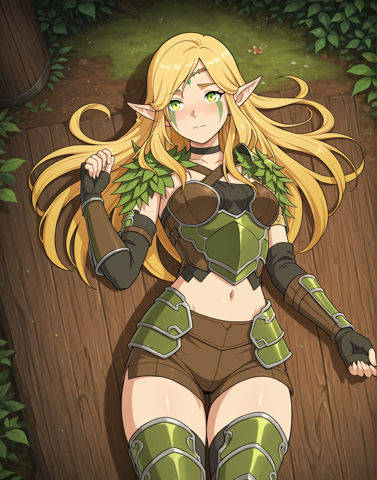Anwen_COH, anwen, blond hair, green eyes, pointy ears, elf, long hair, brown shorts, plackart, wooden armor, green hip armor, green metal hip guards,