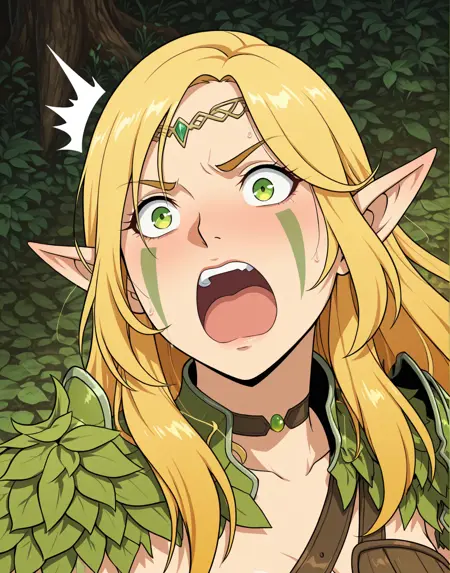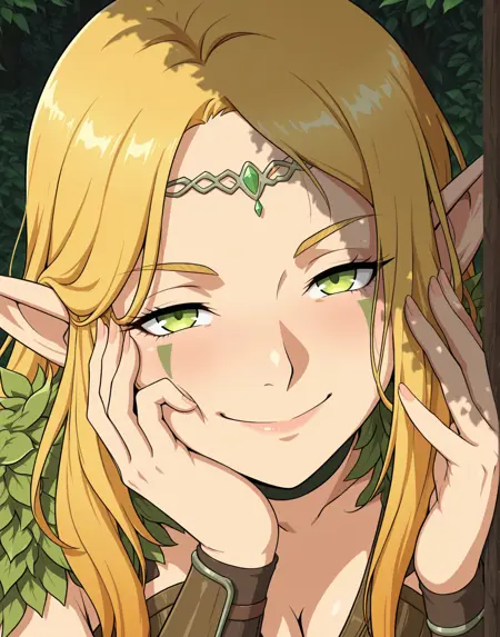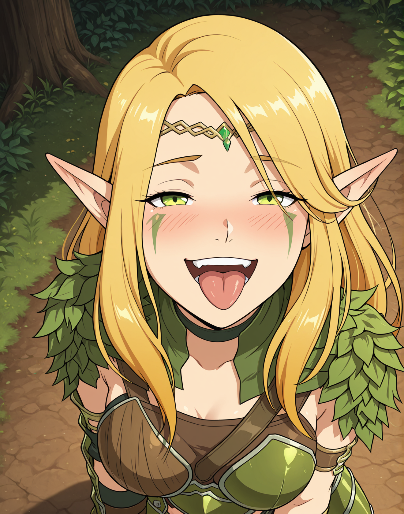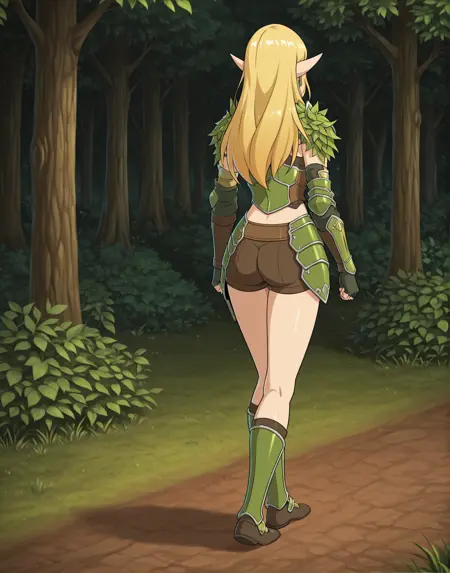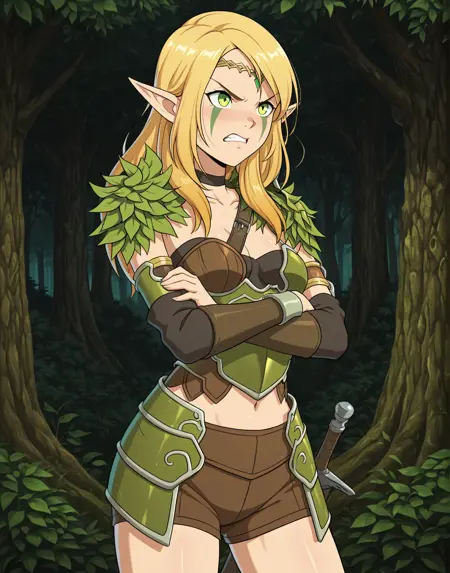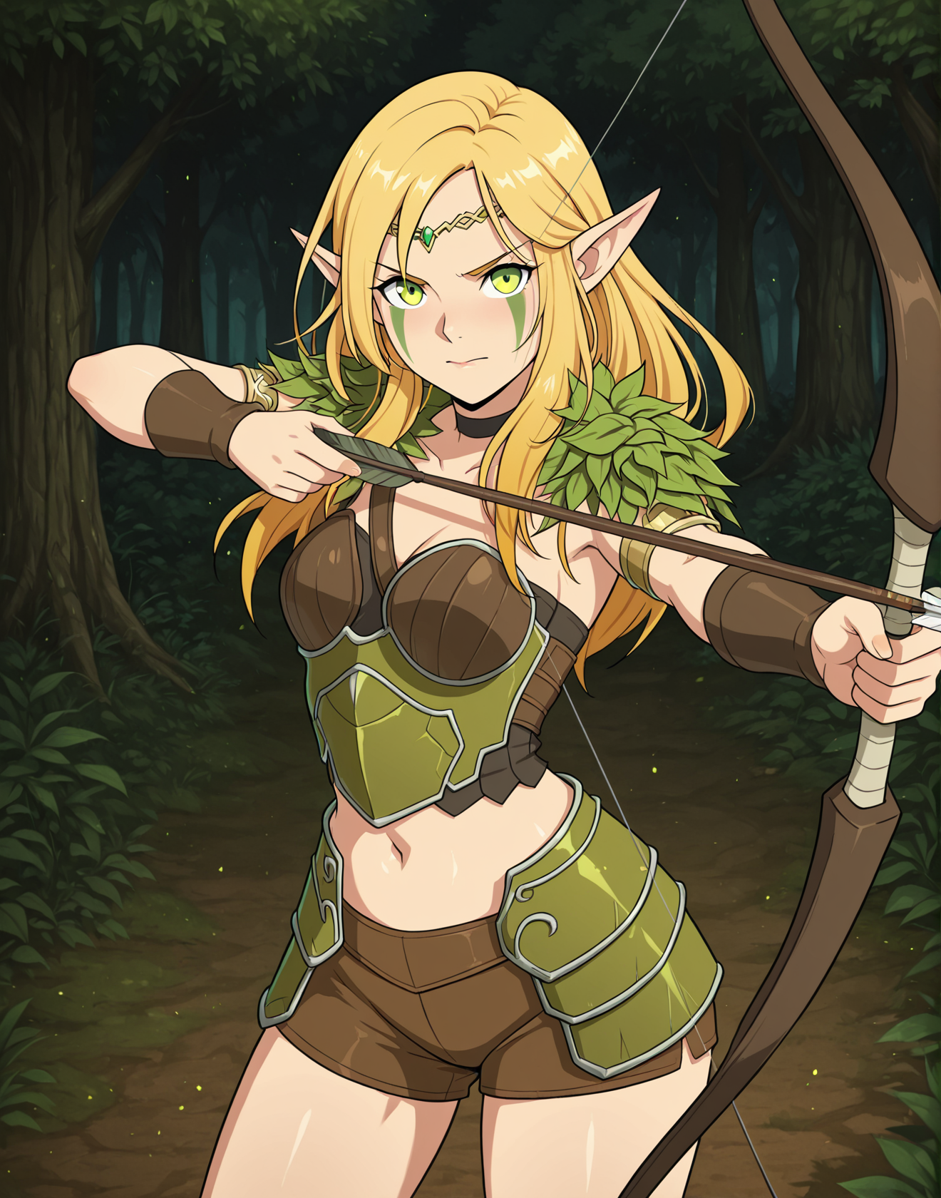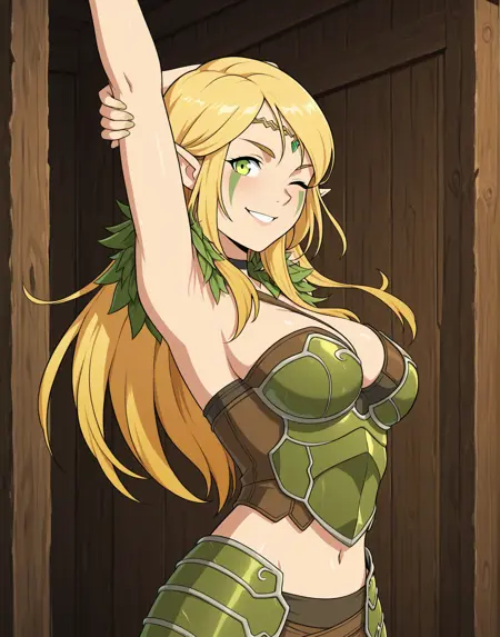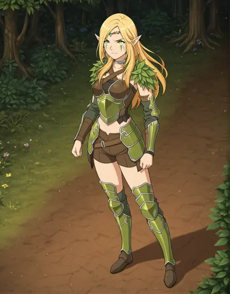 Anwen_COH, anwen, blond hair, green eyes, pointy ears, elf, long hair, brown shorts, plackart, wooden armor, green hip armor, green metal hip guards,