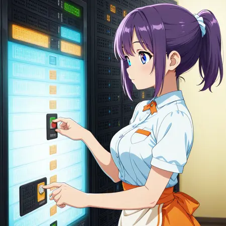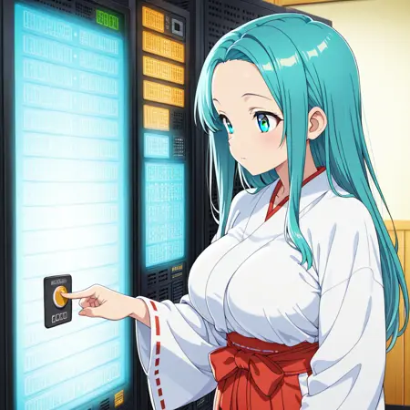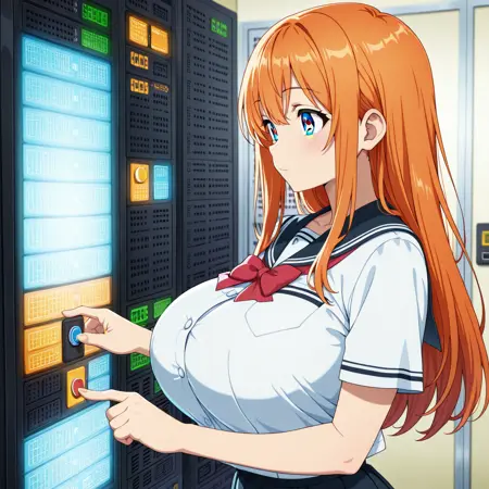 Civitai データセンターでサーバーラックのボタンを長押ししてる少女 / A girl long-pressing the server rack button in a data center