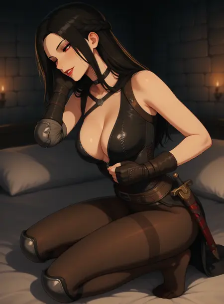 brown fingerless gloves, brown pantyhose, cleavage, brown leather, sheath, bare shoulders, belt, zipper, knee pads, thighband pantyhose, sheathed, unzipped