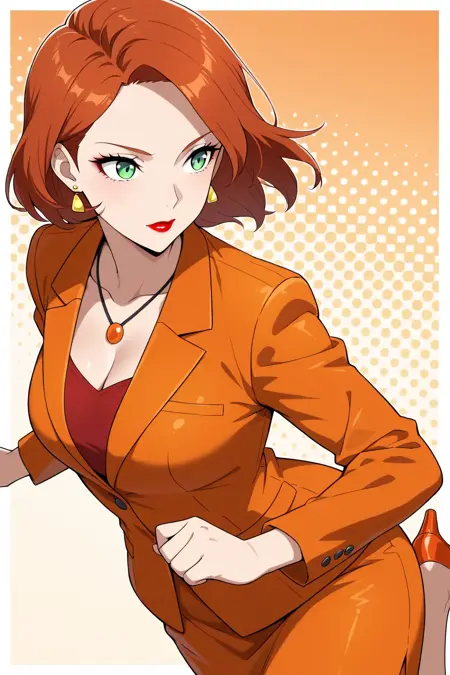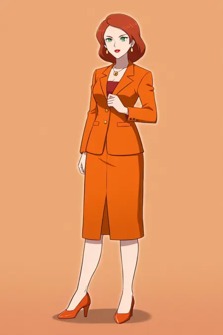 ScarletGarciaSX, 1girl, short auburn hair, light skin, red lips, lipstick, bright orange skirt suit, red shirt, bright orange blazer, knee-length orange skirt, orange-red heels, small pendant necklace, yellow earrings, green eyes