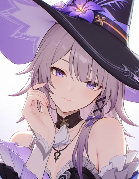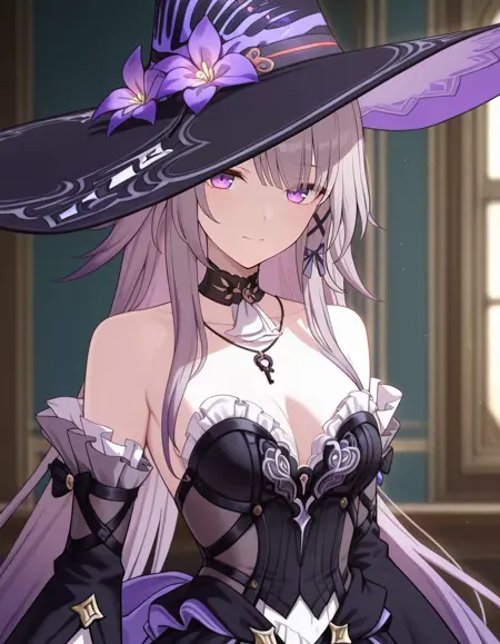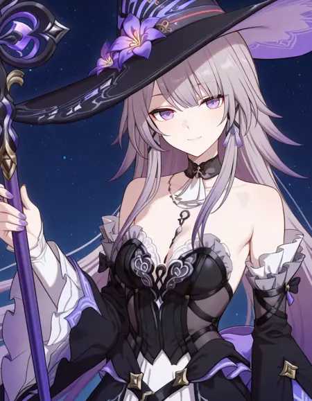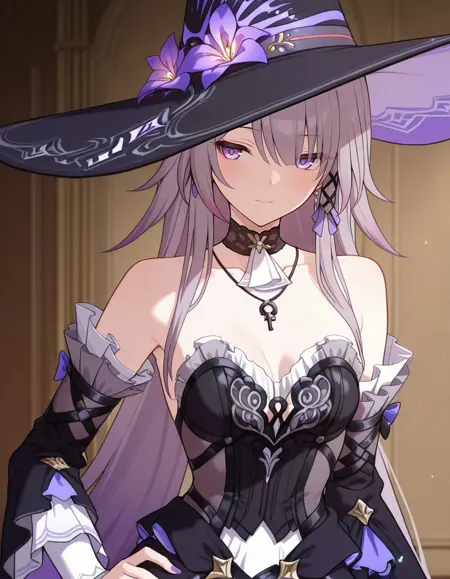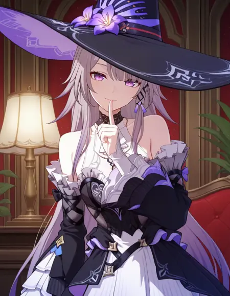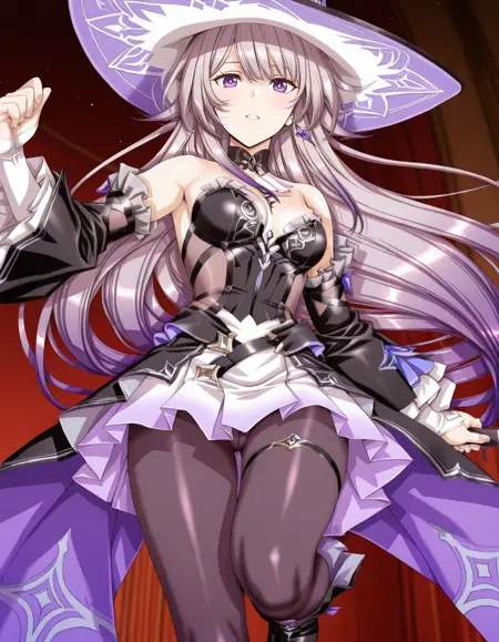 mai_madamherta_(honkai_star_rail),long_hair,grey_hair,purple_eyes,witch,witch_hat,dress,bare_shoulders,white_skirt,pantyhose,thigh_strap,boots,black_footwear