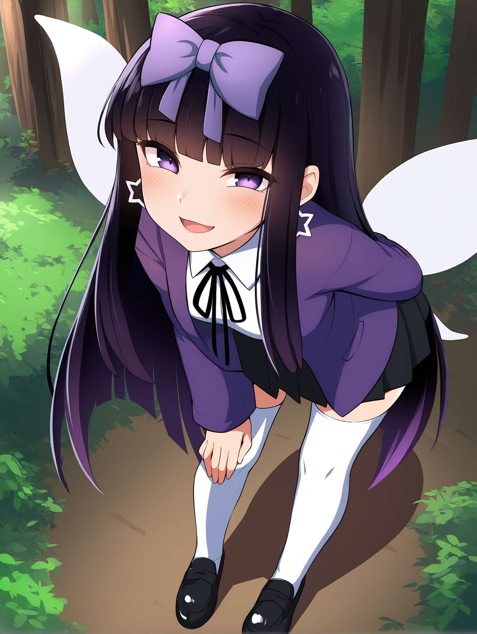 ribbon,neck ribbon,black ribbon,bow,purple bow,pink bow,hair bow,jewelry,earrings,star earrings,star sapphire,crescent,fairy wings,jacket,white shirt,purple jacket,long sleeves,collared shirt,pleated skirt,black skirt,blazer,purple coat,miniskirt,white thighhighs,black footwear,loafers,shoes