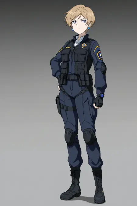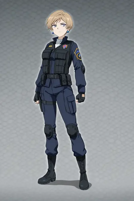 | トレーニングワード | TopazSX, 1girl, dark blue tactical uniform, black padded vest, hexagonal shoulder patch, utility belt, black-blue fingerless gloves, reinforced knee pads, black boots, Short sandy-blonde hair, pale skin, blue‑gray eyes, blue earrings,コピーしました! |