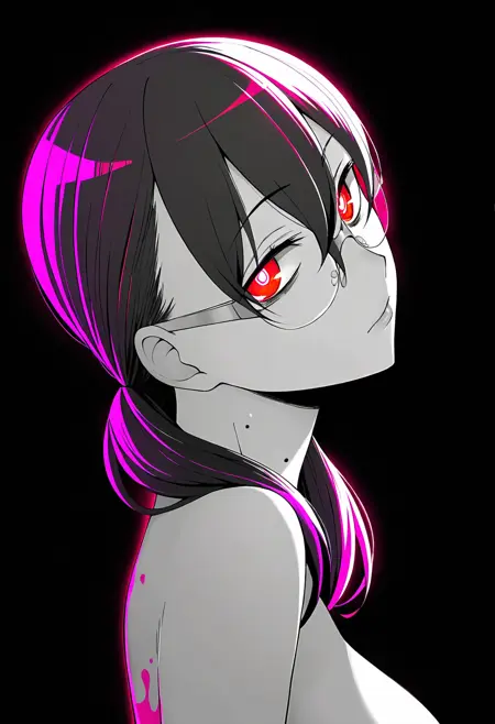 mikurasayako,glasses,red eyes,low twintails,mole under eye,mole on neck