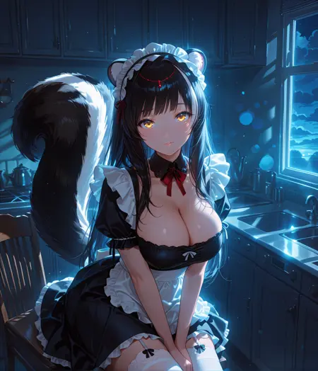 Nagamaid, yellow eyes, head chain, long hair, multicolored hair, black hair, white hair, streaked hair, maid headdress, skunk ears, skunk tail, animal ear fluff, large breasts, black dress, maid apron, short sleeves,white garter straps, white thighhighs, black high heels,