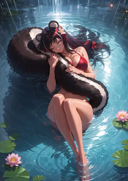 Nagabase, yellow eyes, head chain, long hair, multicolored hair, black hair, white hair, streaked hair, hair flower, skunk ears, skunk tail, animal ear fluff, red hair ribbon, large breasts, jingle bell, bare shoulders, white kimono, short kimono, off shoulder, obi, sleeves past wrists, sleeve bow, floral print, red ribbon, tassel, black skirt, short skirt, rudder footwear,