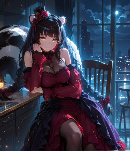 Nagadress, yellow eyes, head chain, long hair, braided hair, red hair bow, twin braids, multicolored hair, black hair, white hair, streaked hair, black mini top hat, hat flower, skunk ears, skunk tail, animal ear fluff, large breasts, bare shoulders, gothic dress, frilled dress, red dress, purple dress, two tone dress, lace trim, detached sleeves, sleeves past wrists, see-through, brown pantyhose,