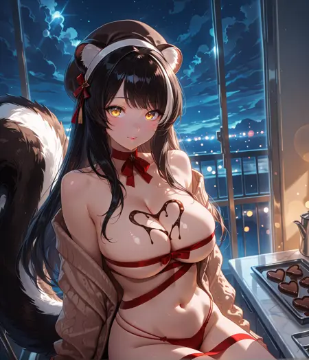 Nagavalen, yellow eyes, long hair, multicolored hair, black hair, white hair, streaked hair, beret, skunk ears, skunk tail, animal ear fluff, large breasts, cleavage, red ribbon choker, naked ribbon, red ribbon, belly button, brown cardigan, open cardigan, red string panties, off shoulder,