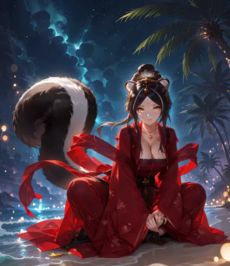 Nagchina, yellow eyes, hair ornament, forehead mark, long hair, single hair bun, parted bangs, multicolored hair, black hair, white hair, streaked hair, skunk ears, skunk tail, animal ear fluff, large breasts, cleavage, green ring, gold necklace, red hanfu, wide sleeves, red shawl,