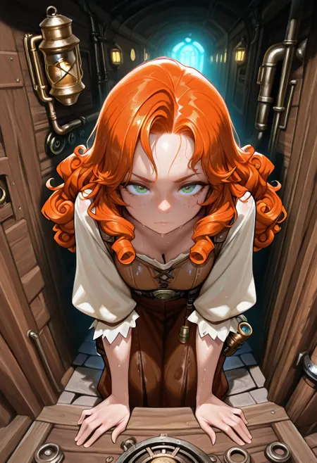 트리거: curlg1ng3r hair, 1girl, solo, long hair, orange hair, freckles, curly hair