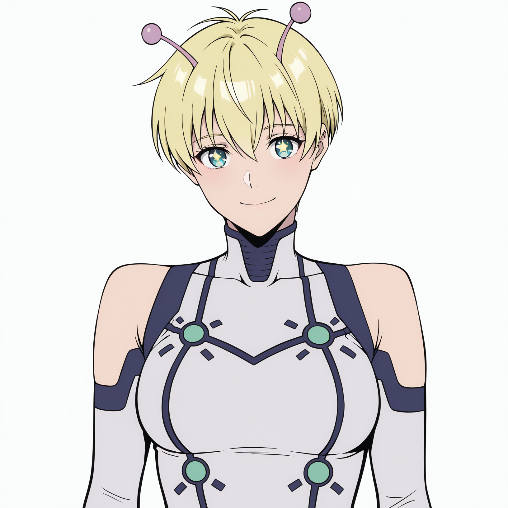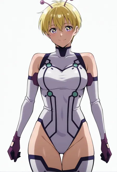 vamolawz, very short hair, blonde hair, antennae, alien, white leotard, spacesuit , turtleneck bodysuit, skin tight, thigh boots, white boots, purple gloves, star \(symbol\), star in eye, symbol in eye, medium breasts, bare shoulders