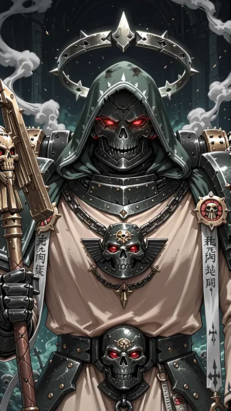 1boy, red eyes, glowing eyes, helmet, black skull, dark green armor, dark green hood, beige robe, iron halo, holding crozius, crozius, holding sword, smoke