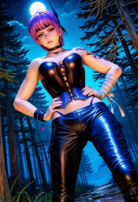 ayane_(fatal_frame), black headband, leather, midriff, right_bandage_arm, left_arm_bracelet, bustier, large_breasts, red_eyes, back_tattoos, body_tattoos, short_hair, highly_panties, tattoos, shoulder_tattoos, boots, corset, bare_shoulders, choker, purple_hair, highleg_panties, highleg_thong, leather_pants, cleavage