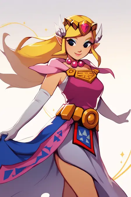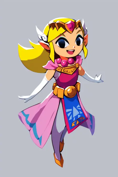 toon zelda, 長い髪, 金髪, 尖った耳, 化粧,追加: 肘まで手袋, ドレス, ピンクのドレス, 白い手袋, ジュエリー, チビ, 青い目, 黒い目