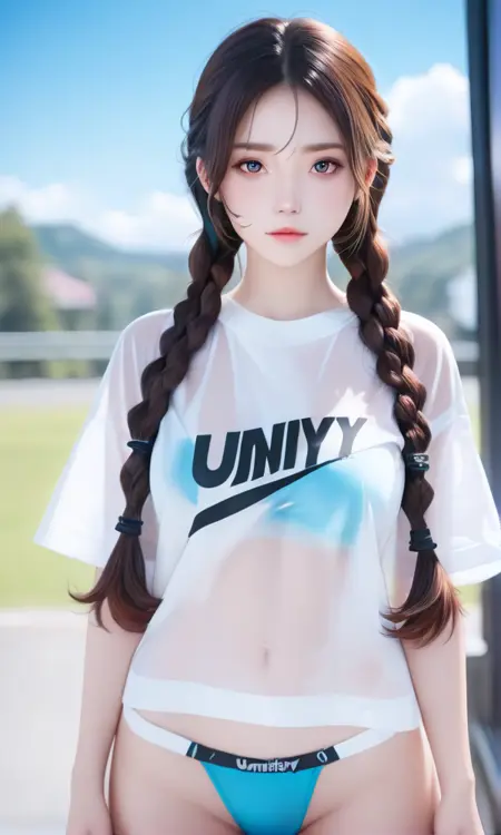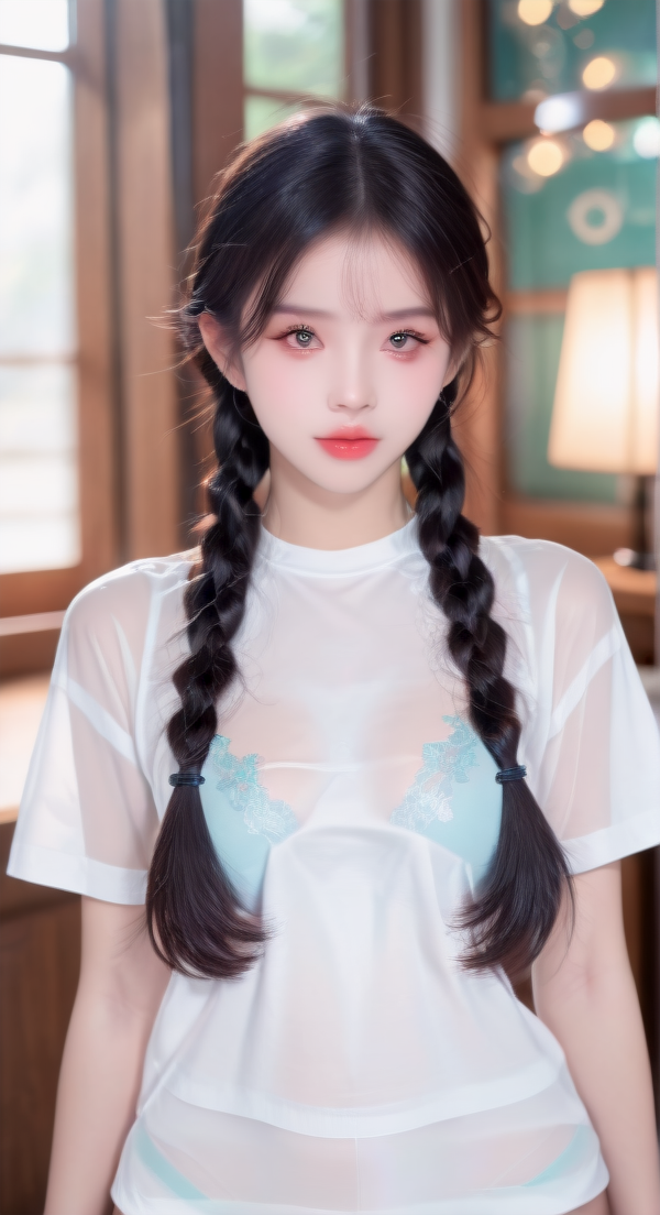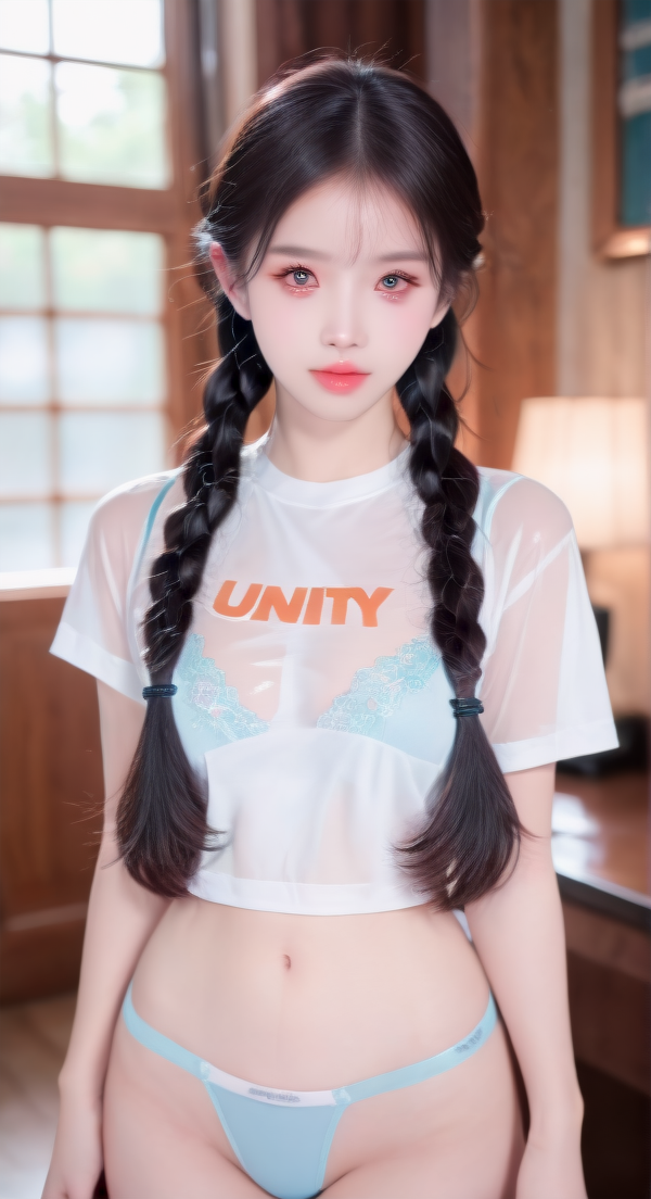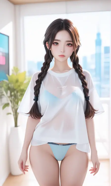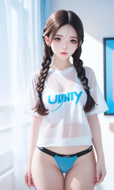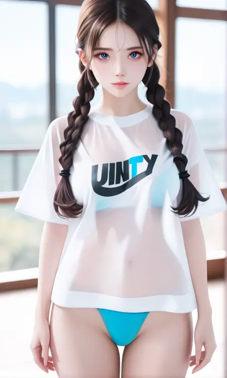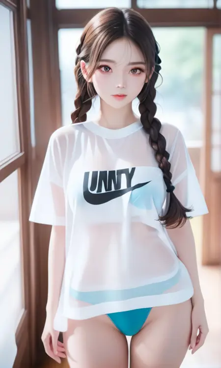 提示词:cute-shirt, panties, blue panties, see-through, bra, white shirt