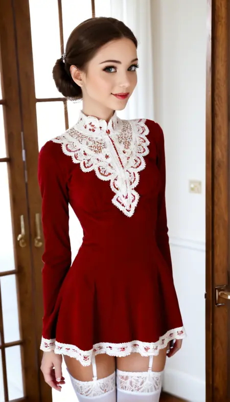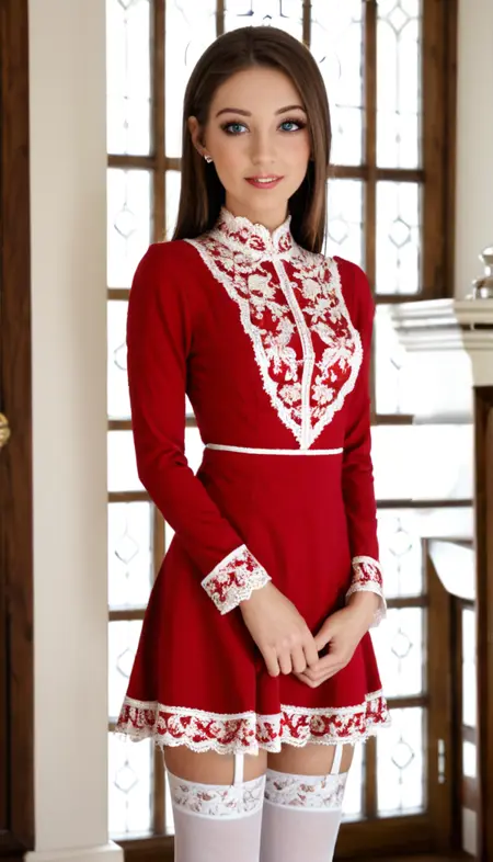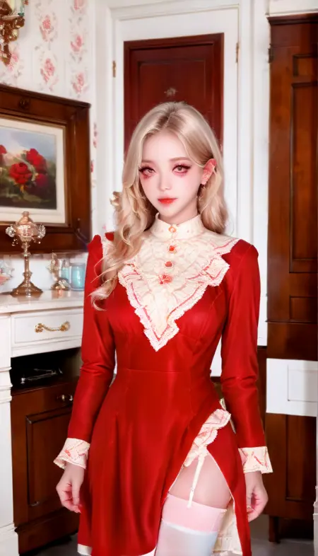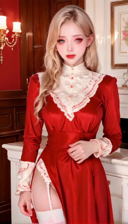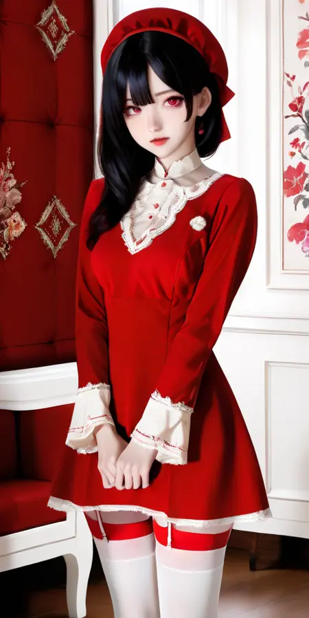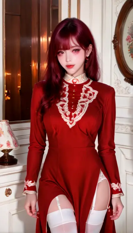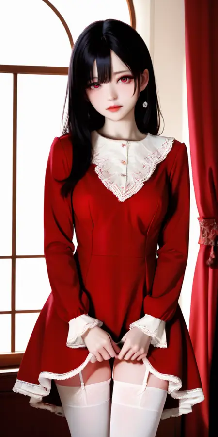 프롬프트 단어: red-dress, white thighhighs, dress, red dress, garter straps, long sleeves