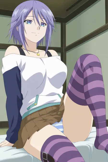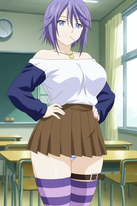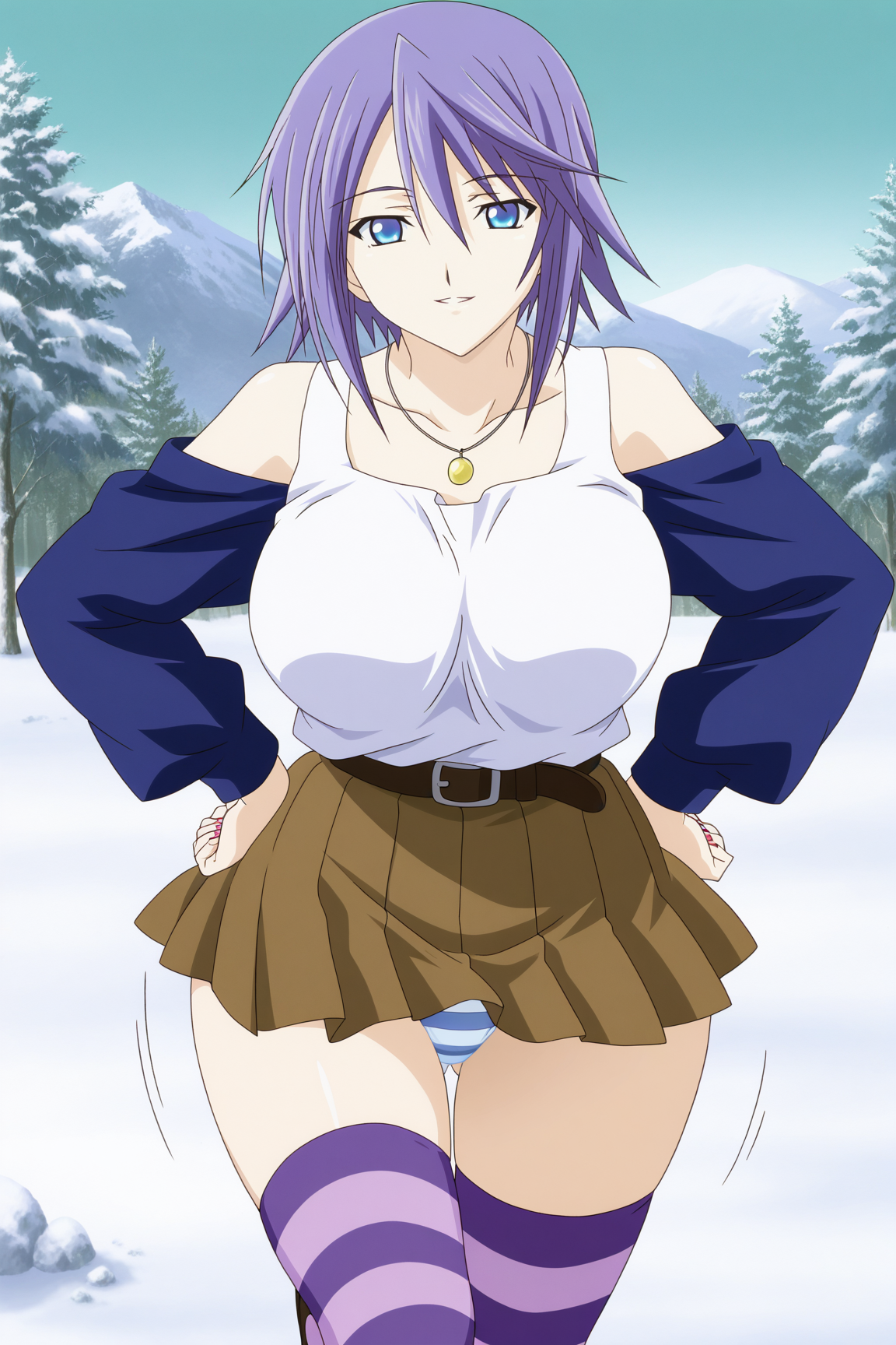 学校制服: みぞれの衣装、白いシャツ、肩出し、濃い青の袖、長い袖、紫の太ももハイソックス、ストライプ柄の太ももハイソックス、茶色のスカート、プリーツスカート、ネックレス、片足ベルト、ストライプ柄のパンツ。