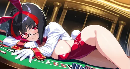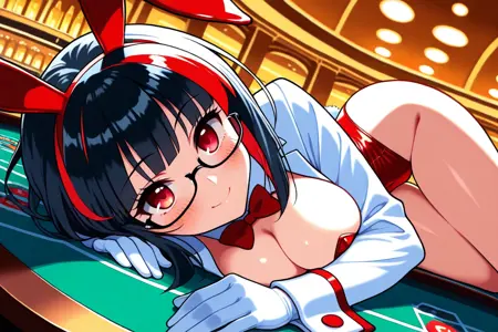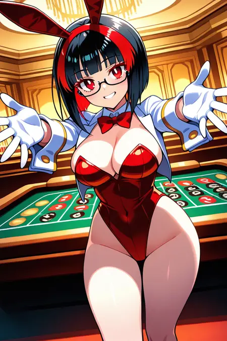 リボンネクタイ、赤リボン、フェイク動物の耳、ウサギの耳、ロングスリーブ、白い袖、白手袋、レオタード、赤レオタード、足出し、プレイボーイベニー、ハイレッグレオタード、手首カフス