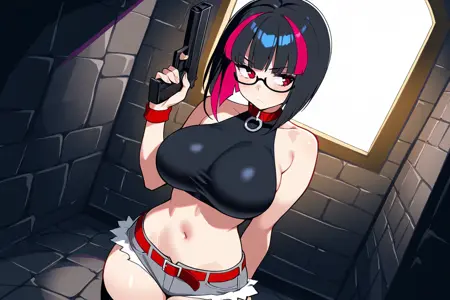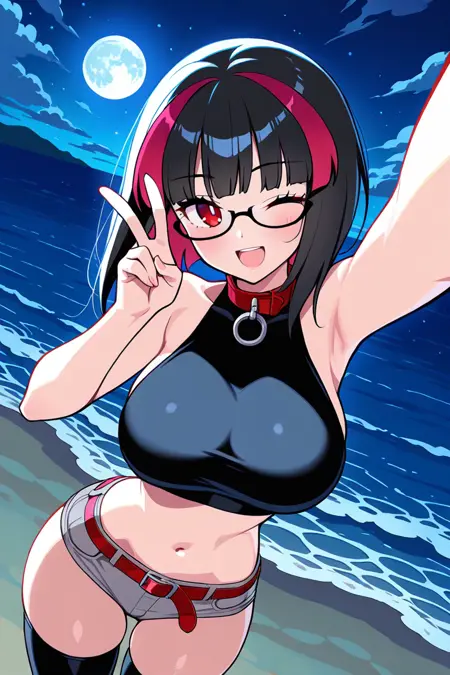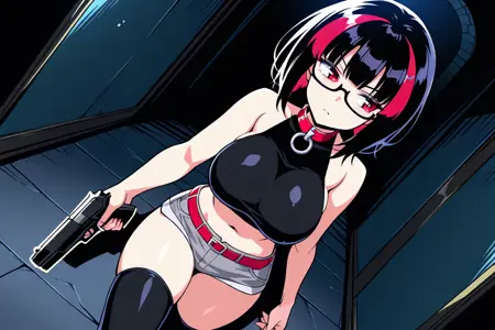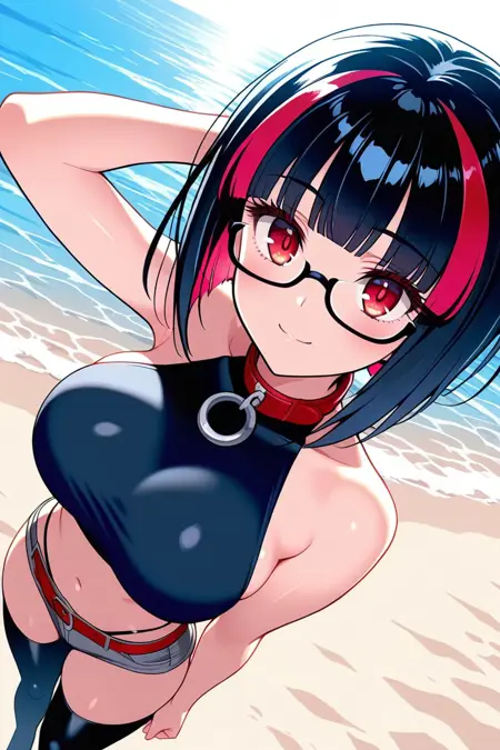 ブラック太ももハイソックス、黒服、ショートパンツ、ノースリーブ、肩出し、ベルト、赤いカラー、乳首カバー、クロップトップ、マイクロショーツ、黒ショーツ